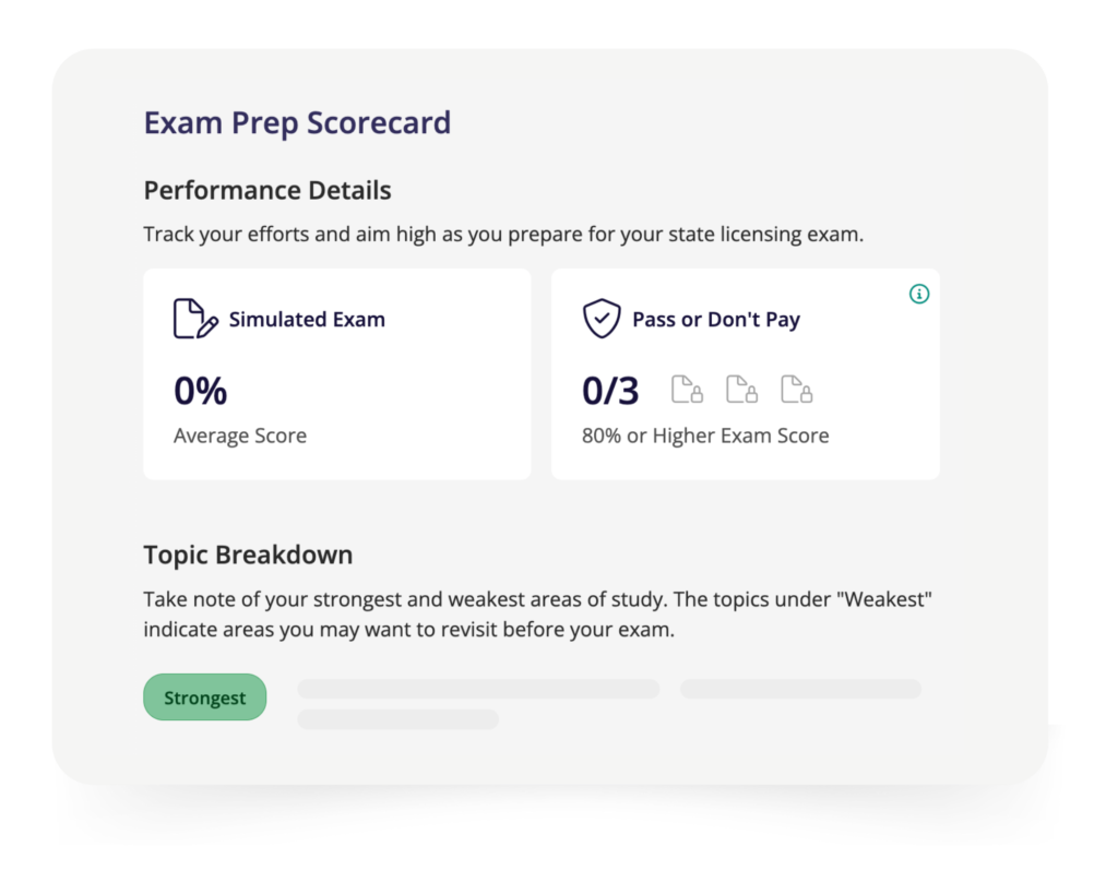 Ensure you’re fully prepared for your state licensing exam with our comprehensive Exam Readiness Indicator. This tool guides you through all the essential steps needed to sit for the exam, including a detailed checklist of to-dos such as completing course requirements, registering for your background check, and other key preparations. Stay organized and on top of every requirement, ensuring you’re well-prepared and confident on exam day
